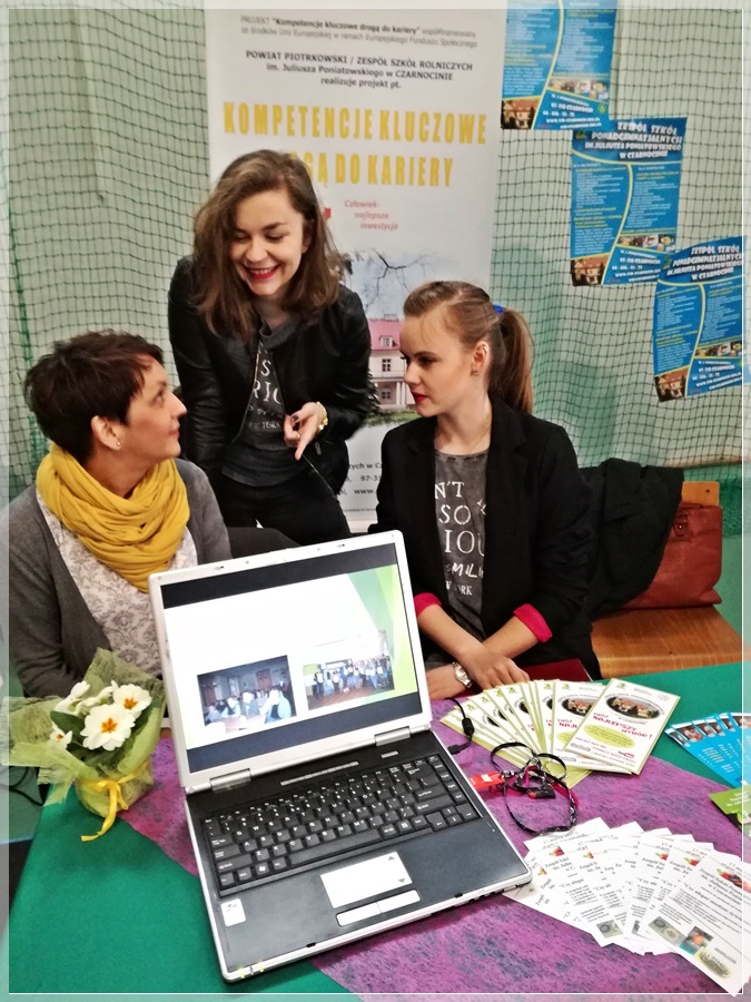 Młodzież odwiedzająca nasze stoisko otrzymała ulotki informacyjne oraz miała możliwość obejrzeć prezentację multimedialną o szkole a także porozmawiać z uczennicami klasy IV TA Olą Kotynią i Olą Ćwikłą oraz nauczycielami p. L. Orlicz i p. E. Sęk.